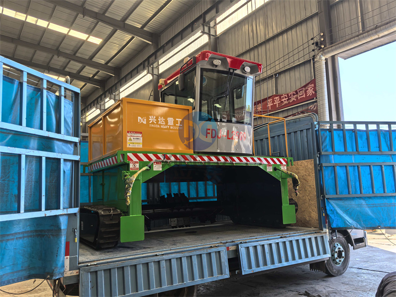 又一台手动式履带翻堆机准备发往聊城现场:手动式履带翻堆机主要用于在条垛式发酵条件下对料堆进行翻抛供氧。卧式螺旋翻抛结构、液压升降、履带行走。 履带式翻堆机(条垛式翻堆机):将物料堆成长条形的垛状,设备骑在垛上进行翻抛作业。投资较小,但占地面积大,受天气影响较大。