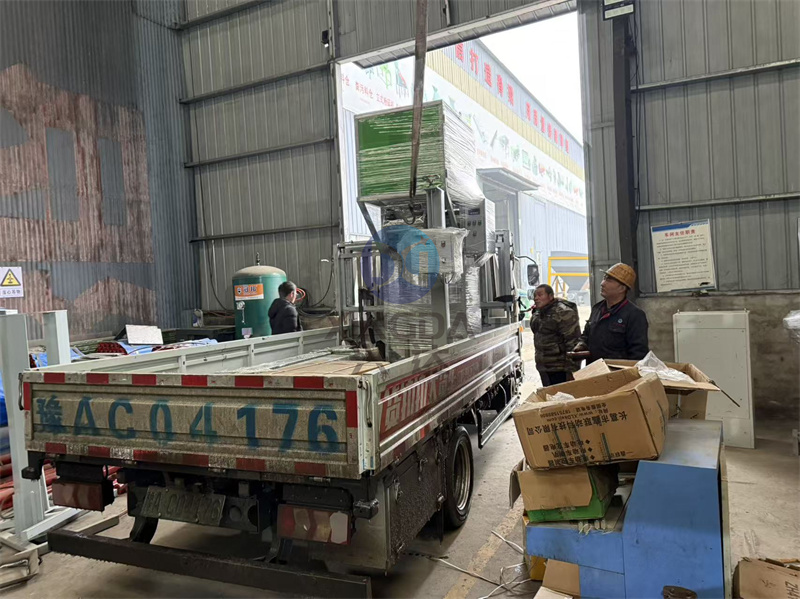 有机肥设备厂区车间正在对一台有机肥包装设备进行装车: